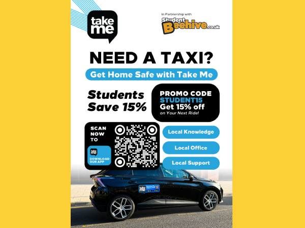Get home safely and affordably with Take Me, your trusted local taxi service in partnership with Student Beehive. Whether you're heading back from a night out, a late study session, or just need a reliable ride, students can enjoy an exclusive 15% discount using the promo code STUDENT15. Simply scan the QR code to download our app and book your ride instantly.